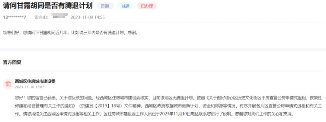 提问:甘露胡同近几年,比如说三年内是否有腾退计划?