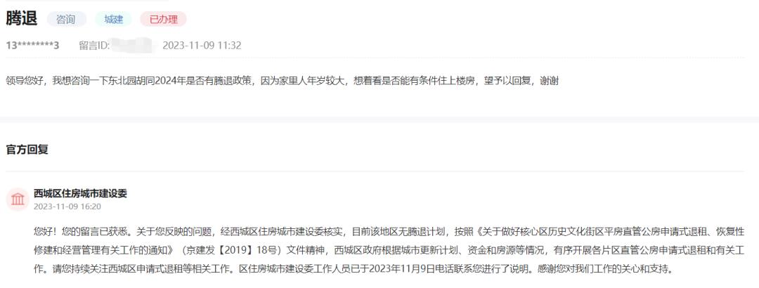 提问:东北园胡同2024年是否有腾退政策,因为家里人年岁较大,想着看是否能有条件住上楼房?