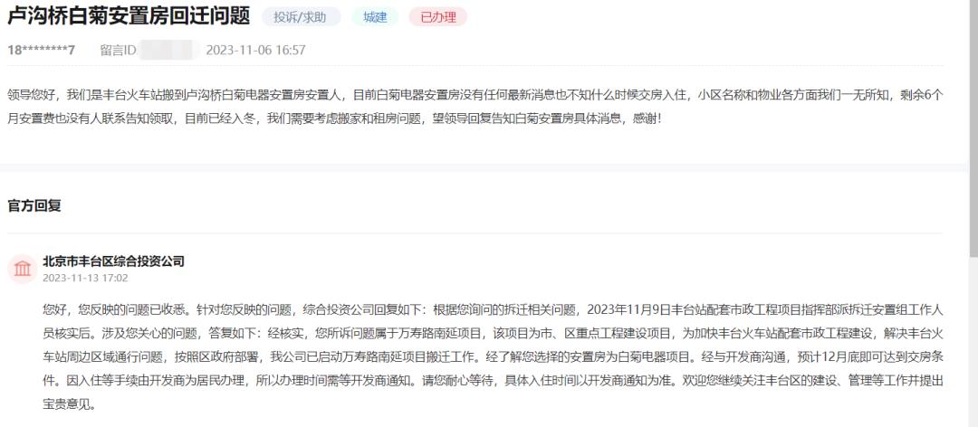 提问:我们是丰台火车站搬到卢沟桥白菊电器安置房安置人,目前白菊电器安置房没有任何最新消息也不知什么时候交房入住,小区名称和物业各方面我们一无所知,剩余6个月安置费也没有人联系告知领取,目前已经入冬,我们需要考虑搬家和租房问题。