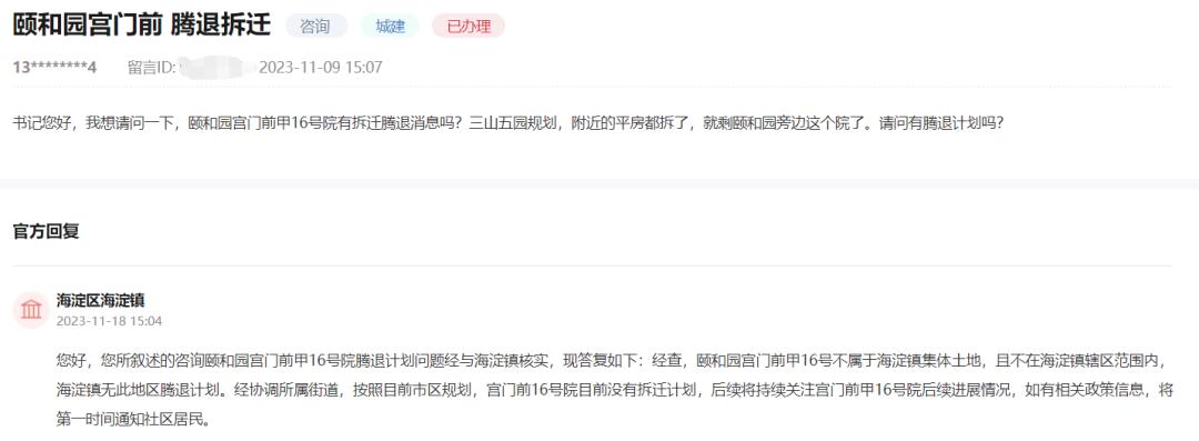 提问:颐和园宫门前甲16号院有拆迁腾退消息吗?三山五园规划,附近的平房都拆了,就剩颐和园旁边这个院了。请问有腾退计划吗?