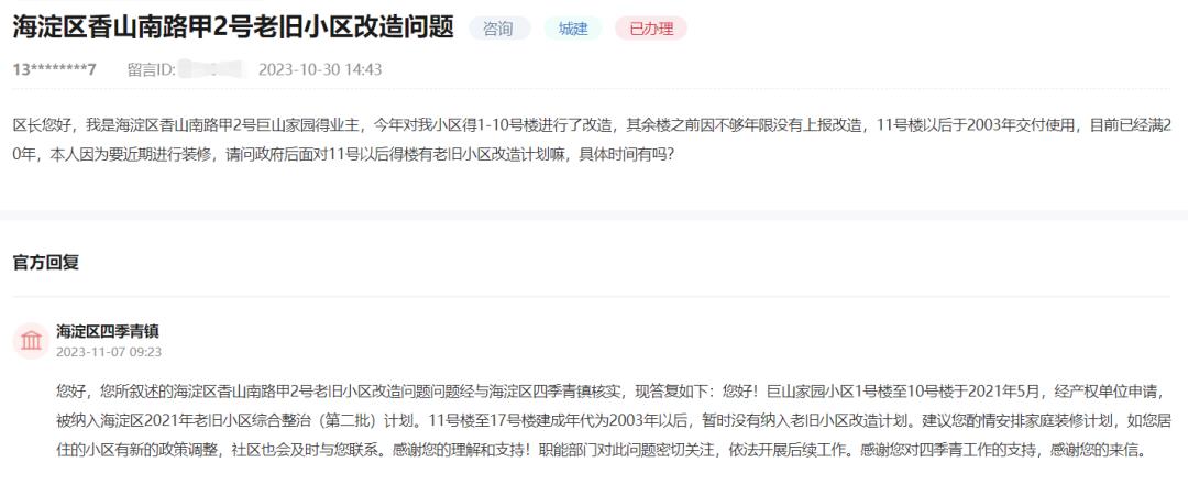 海淀区四季青镇回复:您所叙述的海淀区香山南路甲2号老旧小区改造问题问题经与海淀区四季青镇核实,现答复如下:巨山家园小区1号楼至10号楼于2021年5月,经产权单位申请,被纳入海淀区2021年老旧小区综合整治(第二批)计划。11号楼至17号楼建成年代为2003年以后,暂时没有纳入老旧小区改造计划。