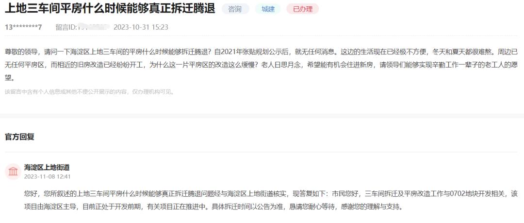 提问:请问一下海淀区上地三车间的平房什么时候能够拆迁腾退?自2021年张贴规划公示后,就无任何消息。