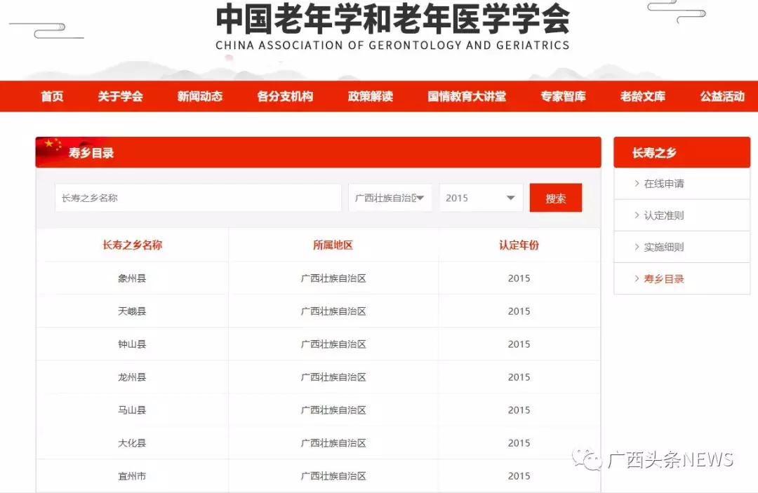 图为官网截图。广西2015年获评“中国长寿之乡”名单。