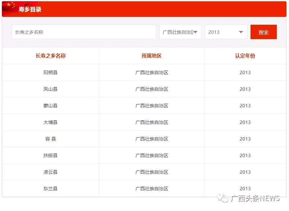 图为官网截图。广西2013年获评“中国长寿之乡”名单。