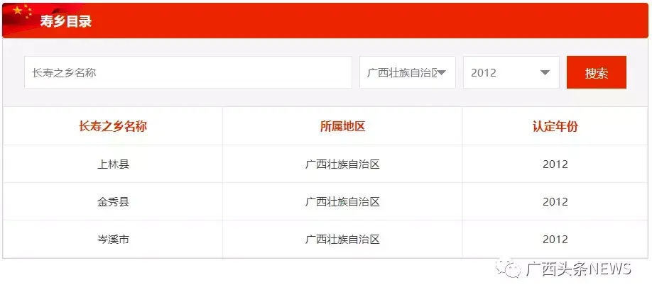 图为官网截图。广西2012年获评“中国长寿之乡”名单。
