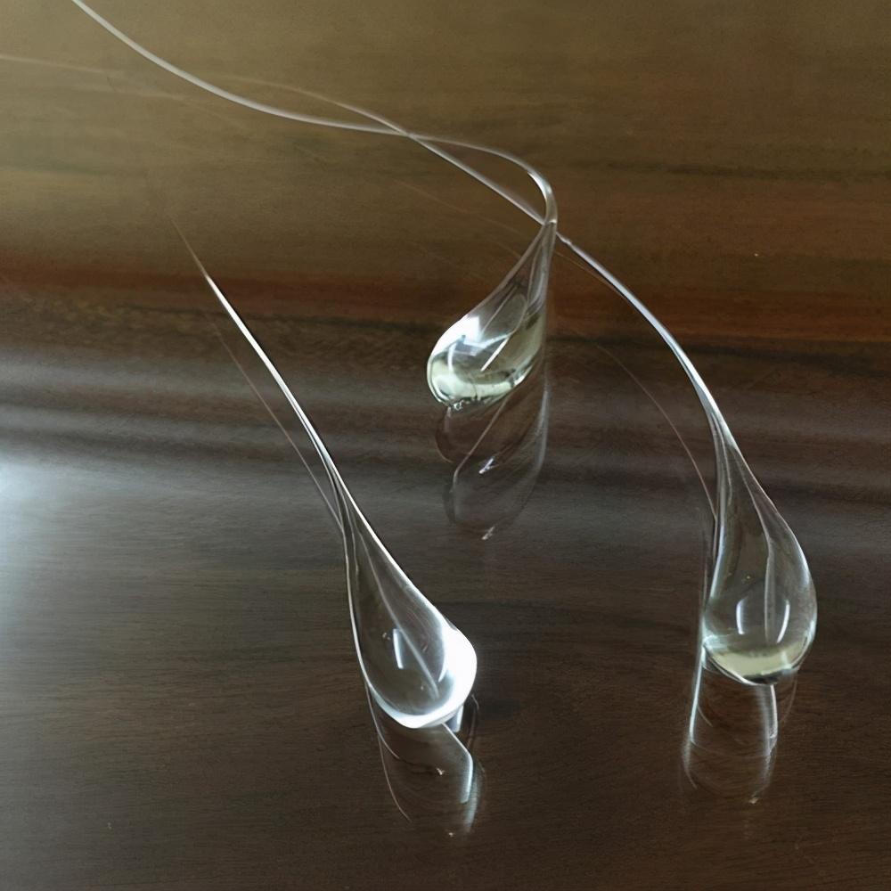 相传在17世纪时,一位名叫“鲁伯特”的王子发明出此物并将其作为贵重的礼物赠予国王,由于它的形状像一滴被拉长了的眼泪,因而得名“鲁伯特之泪”。大家一定会觉得,这么神奇的玻璃,在那个生产设备落后的年代制作起来一定很困难吧?其实,鲁伯特之泪的制作方法并不难,将通过高温加热而熔化的普通玻璃靠重力自然滴到冷水中,这滴玻璃滴会迅速冷却凝固,形成一个头部偏大、尾巴纤细,形似蝌蚪状的玻璃泪滴。通过这样的方法,就可以得到一颗头部能在八吨压力下不碎,硬度比金刚石还大的“鲁伯特之泪”了。是不是只有玻璃能形成鲁伯特之泪?