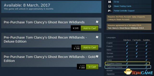 近日steam上架《幽灵行动:荒野》,2017年3月8日正式发售,目前已可预订,普通版¥248,数字版¥248(原价¥288),豪华数字版¥368(原版408)。值得欣喜的是在steam上架的该商品在语言一览上显示支持简体/繁体中文。