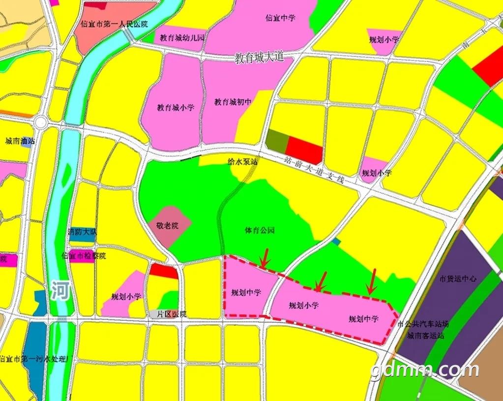 从信宜市人民政府网上公开的《关于征求<信宜市中心城区城西、城东片区发展单元控制性详细规划>意见的公告》中附件1:《信宜市中心城区城西、城东发展单元控制性详细规划》草案公示展板中的规划图可见,规划的学校极有可能就在下图中的绿地位置: