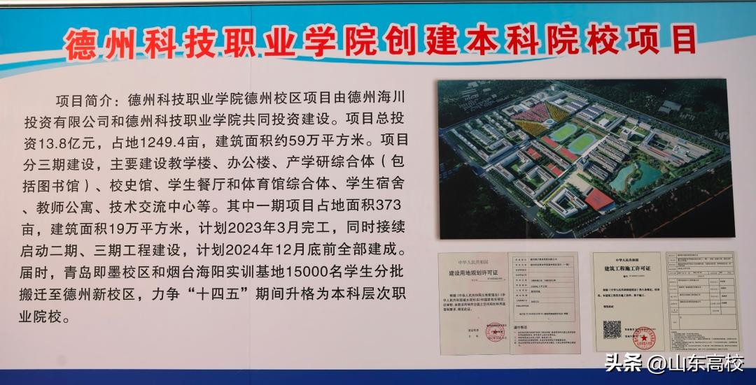 此前,2021年12月,德州科技职业学院创建本科院校项目宣传栏也曾提出:青岛即墨校区和烟台海阳实训基地15000名学生分批搬迁至德州新校区,力争“十四五”期间升格为本科层次职业院校。