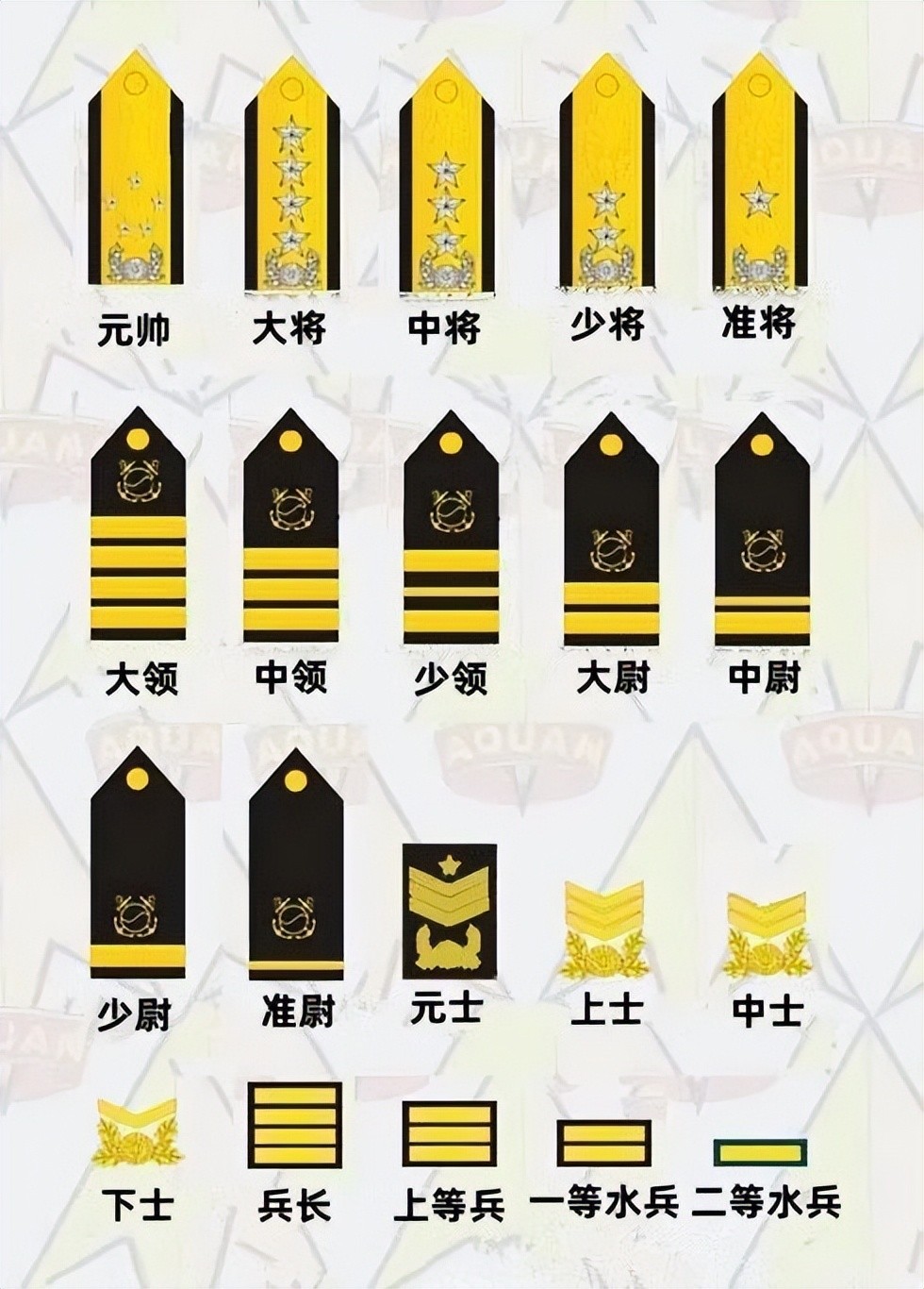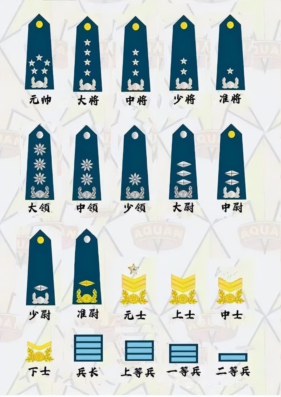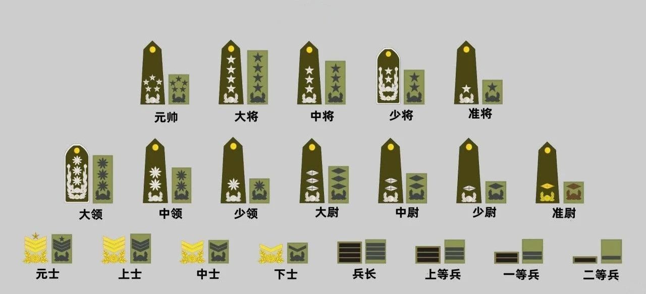 整个陆军共拥有11个军、39个师和19个旅,陆军的军衔和肩章如下: