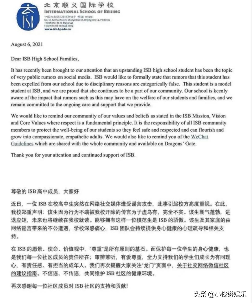 近日,北京顺义国际学校,也就是黄多多所就读的学校ISB出面发声,称最近有一位ISB在校高中生在网络社交媒体遭受谣言攻击,此事引起了校方高度重视。