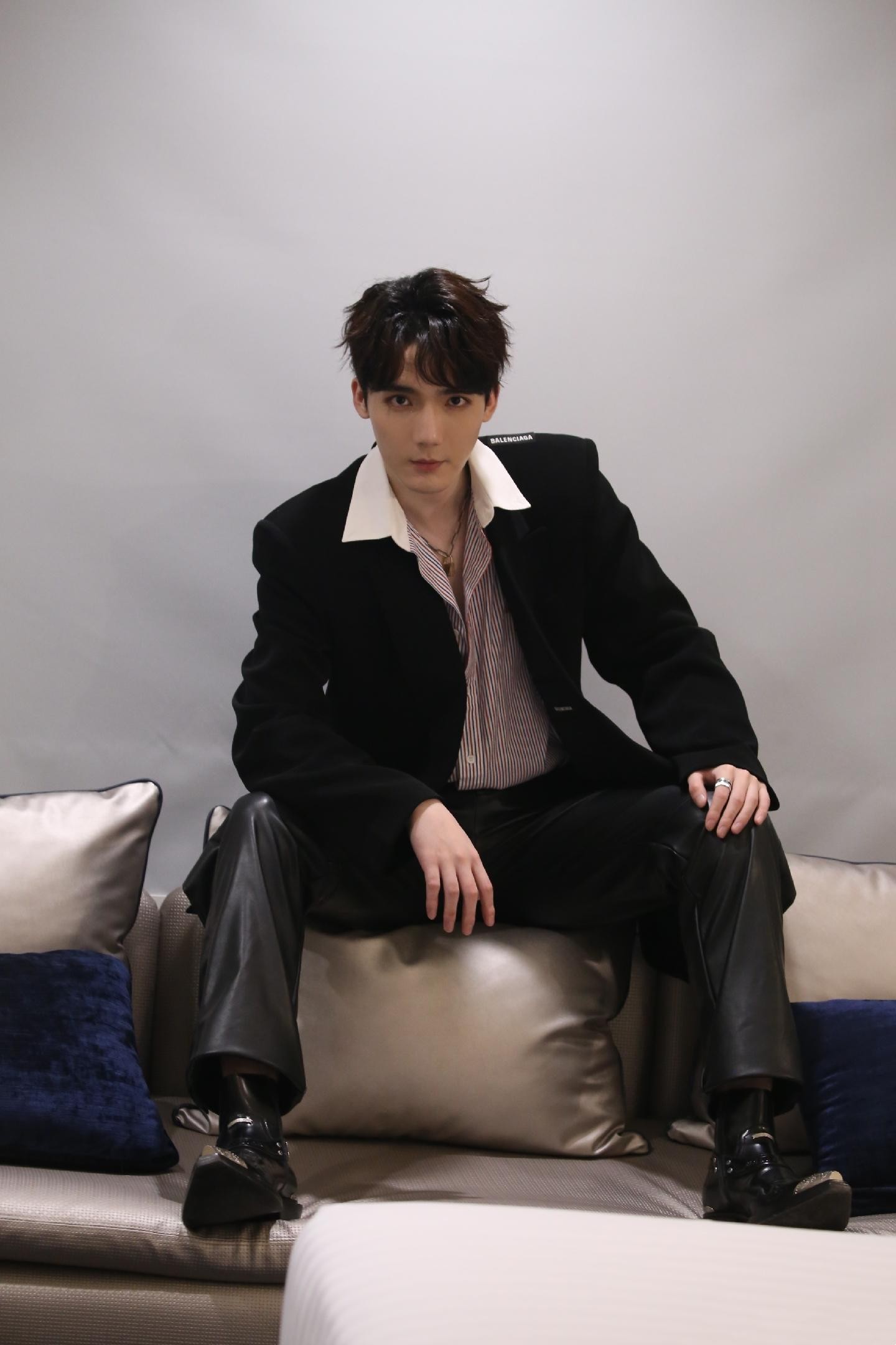 难以驾驭的黑皮裤也被他穿出了别样的时尚,上身用红白条纹衬衫搭黑色丝绒西装,明朗俊秀的同时不乏端正高雅。下身配黑色皮裤,满满的混搭感倒也不显突兀,反而给人另类时髦的既视感。