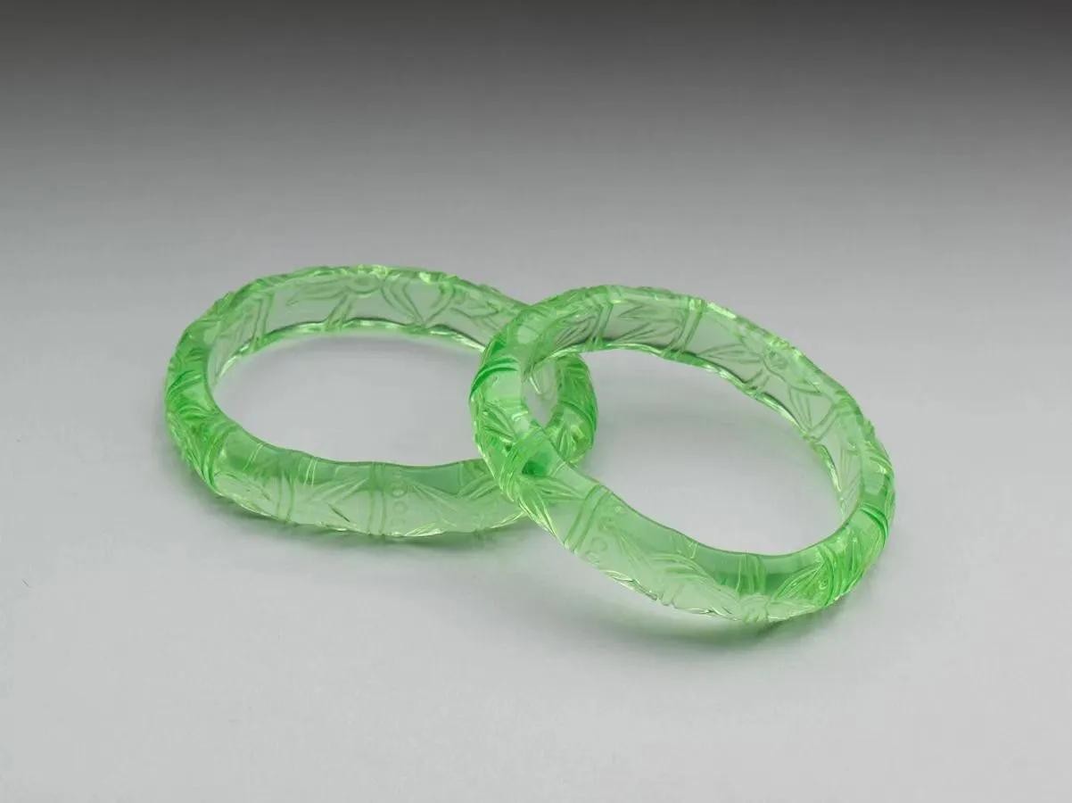 除了这枚扳指还有一对竹节式的玻璃手镯,竹节的雕刻很是精湛,图案很是逼真,在这夏日炎炎的天气下,这对玻璃手镯会显得格外的清新。