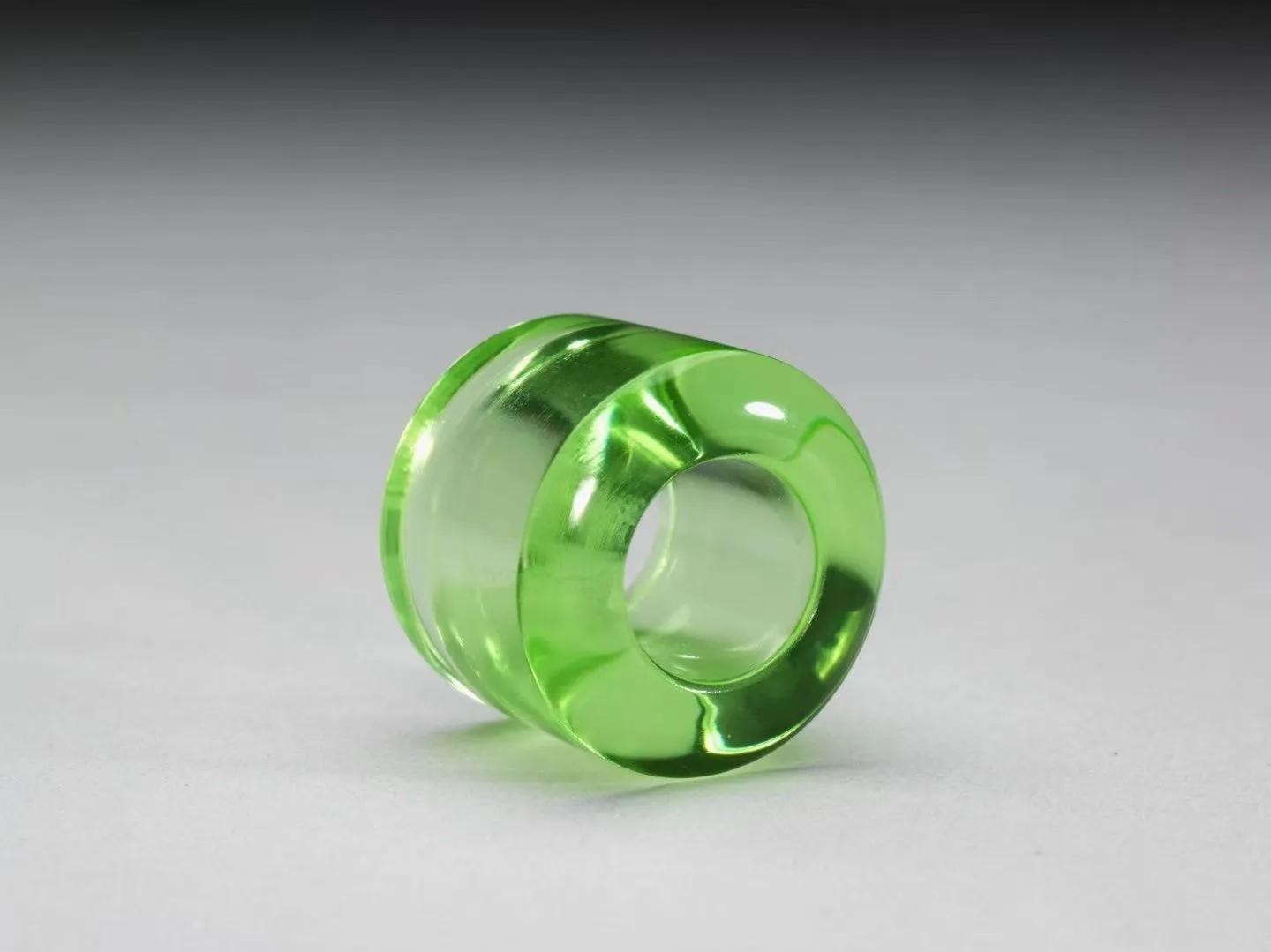 提起玻璃工艺品不得不提台北故宫博物馆,这个博物馆里边珍藏有很多精美的玻璃工艺品。给大家展示一下这枚晶莹剔透的绿色扳指,具有很高的透明度,这种荧光绿的颜色让人看了之后特别醒目,特别清爽。