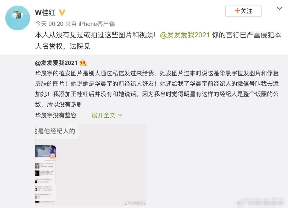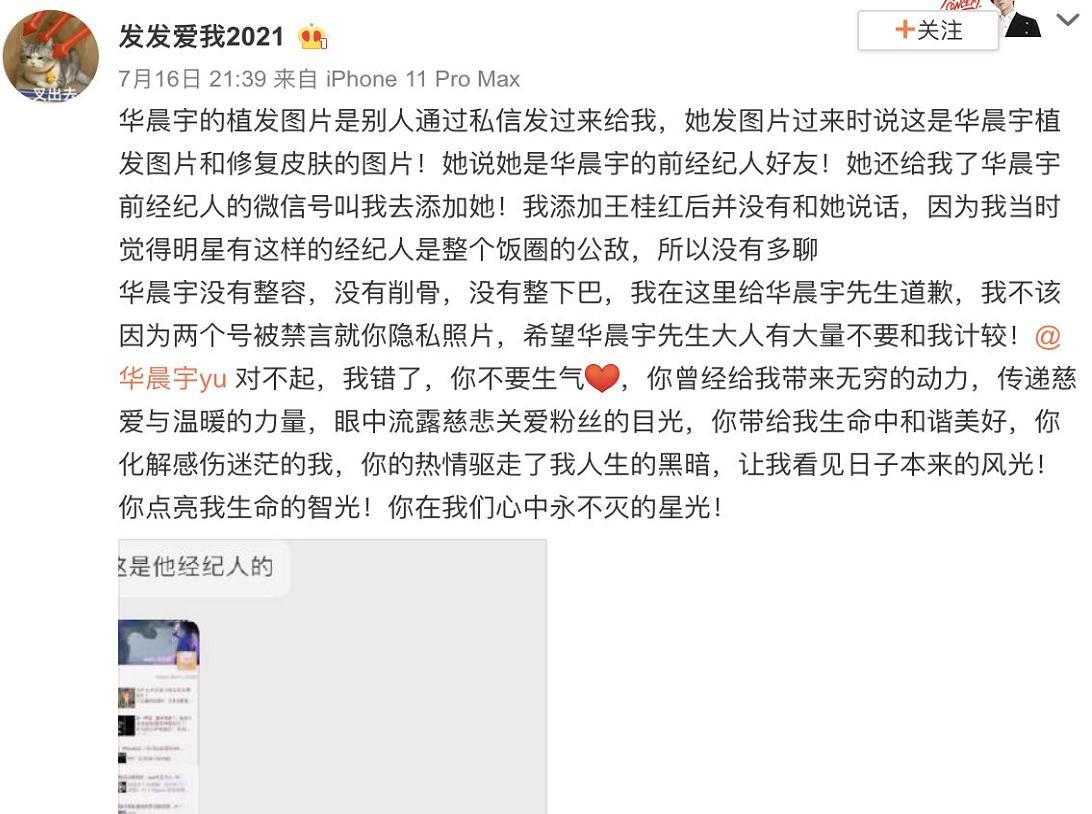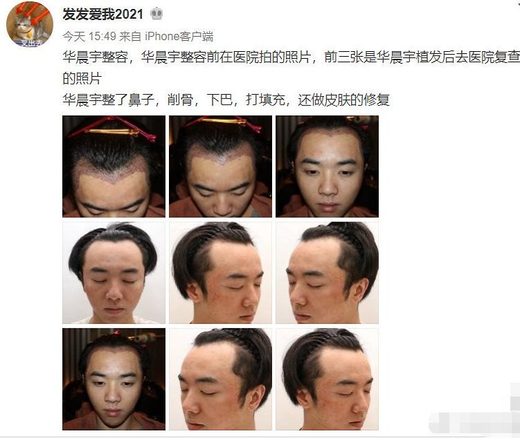 但是在大家争相讨论的时候,这位爆料者又自己打脸了,公开向华晨宇道歉,称“华晨宇没有整容,没有削骨,没有整下巴”,还说植发照片是别人私信给她的,而这个私信她的人说是华晨宇前经纪人的好友,还给她推了经纪人的社交账号。在这位博主公开道歉之后,华晨宇的前经纪人也发声回应了这件事情,称“从没有见过或拍过这些图片和视频。”