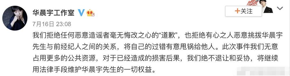 而华晨宇的工作室也公开表明,“拒绝任何恶意造谣者毫无悔改之心的道歉,也拒绝恶意挑拨华晨宇先生与前经纪人之间的关系。”如今流量时代,很多人为了能火,想尽办法的吸引大家的注意力,对于这件事情,相信大家都有自己的看法。把你们的想法评论出来,大家一起聊聊吧!