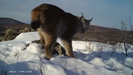另外,还捕捉到一只体形较大的成年猞猁,站在一株达子香下,轻轻地嗅着树干,据砍都河湿地公园工作人员介绍,猞猁是通过鼻子嗅同伴留下的气味,以此寻找同伴。