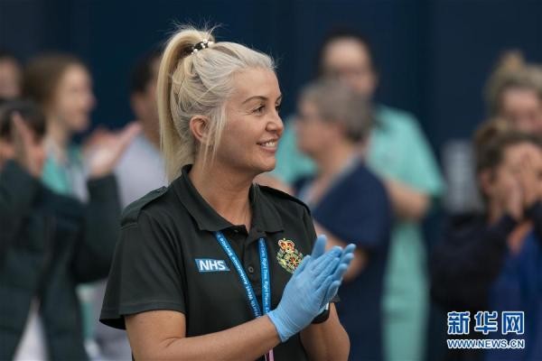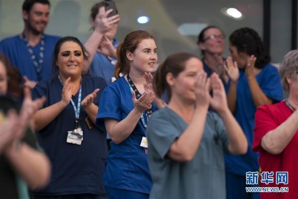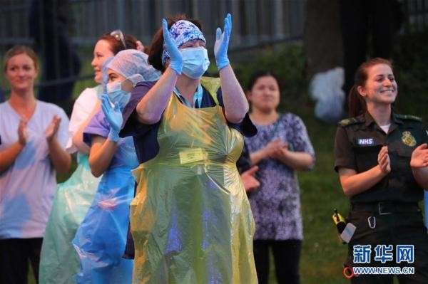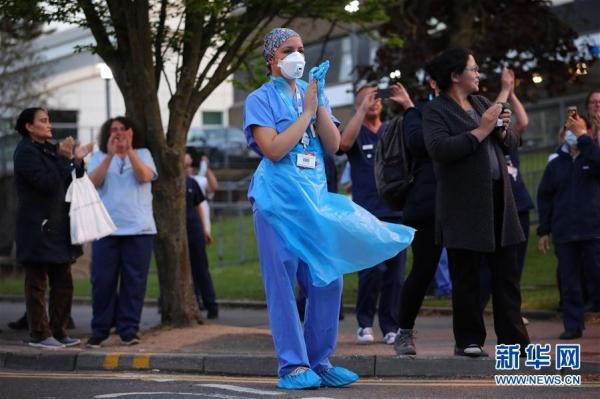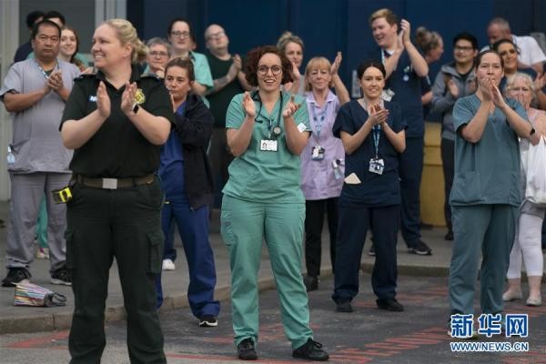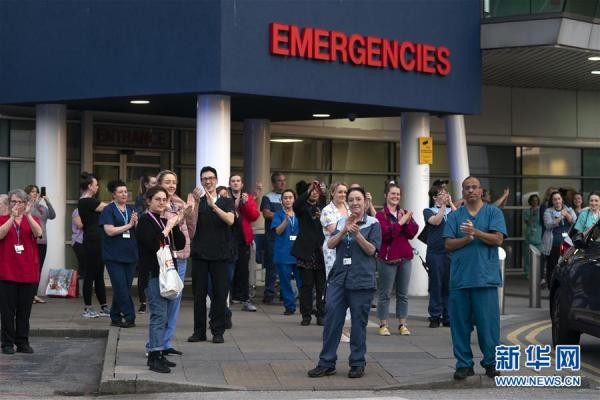 4月23日,在英国利物浦,皇家利物浦大学医院的医护人员在医院外鼓掌。 新冠疫情爆发以来,每周四晚八时,英国人在阳台、门前或窗前鼓掌,向医护人员致敬。部分医院的医护人员也忙里偷闲走出医院,感谢人们的支持,也为自己鼓掌加油。 新华社发(乔恩·休珀摄)