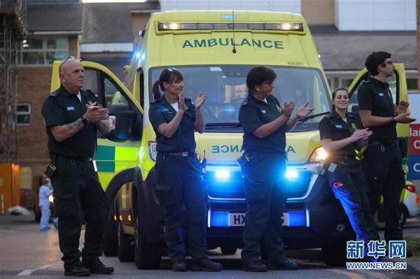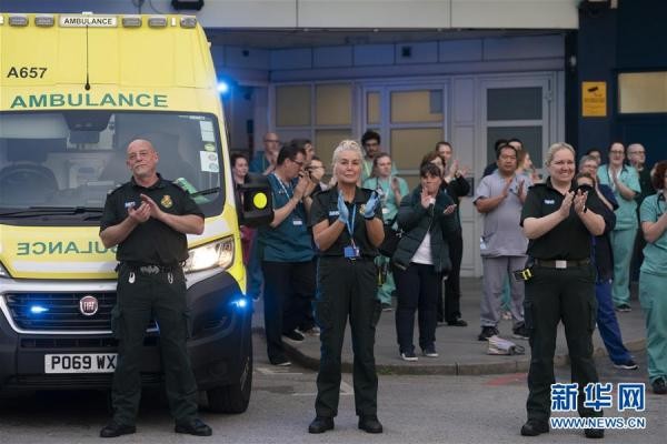 4月23日,在英国利物浦,皇家利物浦大学医院的医护人员走出医院,准备鼓掌加油。他们面前的地面上写着“感谢英国国民保健制度”字样。 新冠疫情爆发以来,每周四晚八时,英国人在阳台、门前或窗前鼓掌,向医护人员致敬。部分医院的医护人员也忙里偷闲走出医院,感谢人们的支持,也为自己鼓掌加油。 新华社发(乔恩·休珀摄)