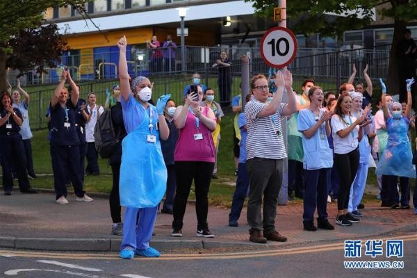 4月23日,在英国雷丁,皇家伯克郡医院的医护人员在医院外鼓掌。 新冠疫情爆发以来,每周四晚八时,英国人在阳台、门前或窗前鼓掌,向医护人员致敬。部分医院的医护人员也忙里偷闲走出医院,感谢人们的支持,也为自己鼓掌加油。 新华社发(蒂姆·爱尔兰摄)
