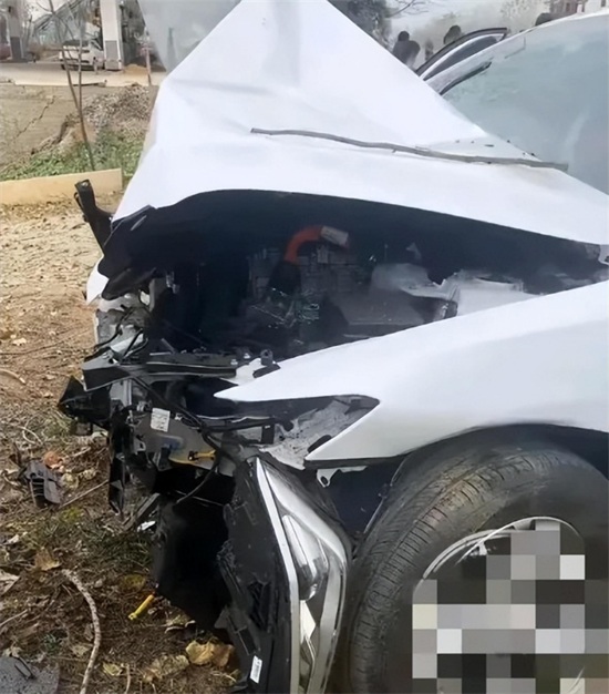 通过现场画面可以看到,这起事故的撞击力度令人触目惊心。肇事车辆的车头已经完全变形,引擎盖被巨大的冲击力掀起,卡在了树干上。车辆的前部零件散落一地,暴露在外的线路清晰可见,显示出撞击的巨大力度。
