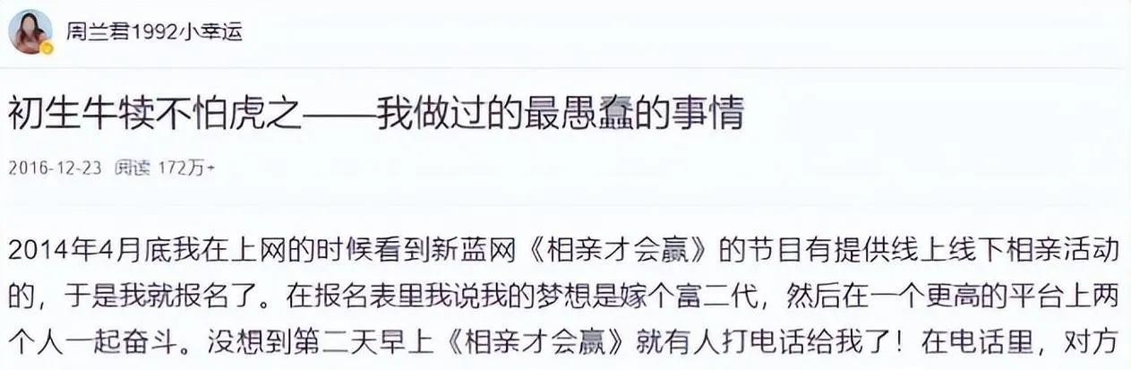 2014年,还在上大二的周兰君参加了《相亲才会赢》节目,她一开场便提出了惊人的择偶条件——只嫁给身价5千万以上的富二代。此言一出,立_即震惊了现场所有人,也迅速在网络上引发了轩然大波。周_兰君表示,自己的美貌、才华和灵魂,如果不能找 到一个合适的富二代作为归宿,那将是一种浪费。_她还透露,_自己在参加节目之前,已经咨询过婚恋机构,得知自己至少可以匹配一个身价2千万 的伴侣,但她对此并不满意,认为自己值得更好的。在节目中,周兰君的几次相亲经历均以失败告终。面对富二代皮皮鲁,她直言不讳地表示,如果对方不是富_二代,那么他的父母就肯定不是勤劳能干的人,自己不愿意叫这样的父母一声爸妈。_这样的言论不仅让皮皮鲁感到不悦,也让广大网友对周兰君的价值观产生了质疑。节目播出后,周兰君遭到了前所未有的网络暴力,各种指责和谩骂如潮水般涌来。 #### 舆论压力下的反思与成长