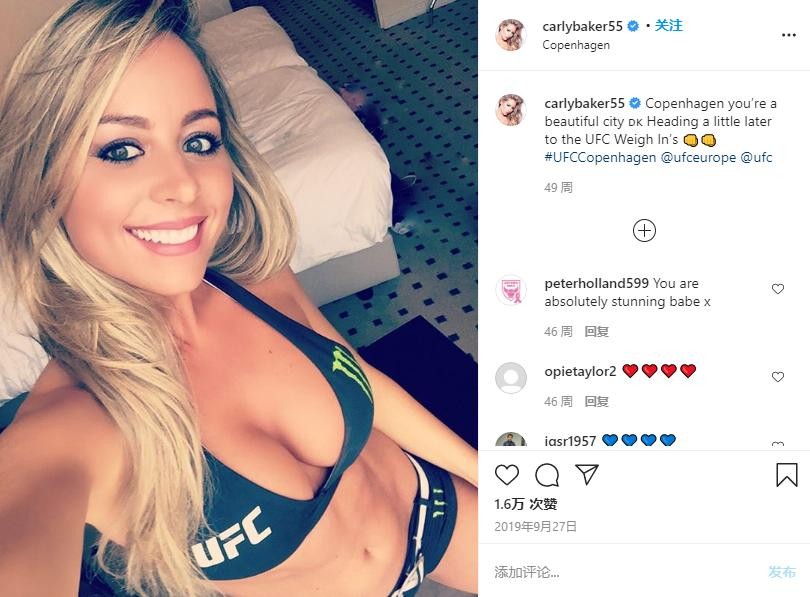 33岁的卡莉·贝克来自英国的温布尔登,她也是第一位来自欧洲的UFC举牌女郎。卡莉·贝克拥有成功的职业生涯,她在INS上拥有超过20万粉丝。除了八角笼的工作外,贝克还练习瑜伽、普拉提、泰拳和舞蹈,多才多艺的她还担任私人教练的工作。