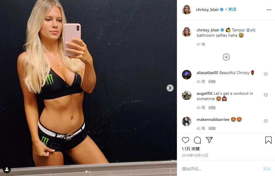 31岁的克里斯西·布莱尔在佛罗里达州出生并长大,她被认为是最炙手可热的UFC举牌女郎。在2013年加盟UFC之前,布莱尔曾在美国专业的MMA和踢拳格斗组织StrikeForce工作。她还曾是《体育画报》的签约模特。