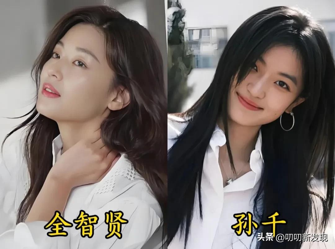 孙千和全智贤真的好像,尤其是眼睛,相似的眼型同款开扇式双眼皮,只是俩人的眼神中透露出不同的韵味。两位均属于淡雅型美女,清新脱俗。然而,孙千的面容中带着一丝未脱的稚气,相较之下,缺少了全智贤那份从容不迫的强大气场。