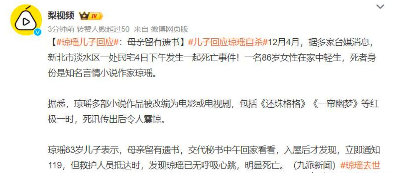 86岁琼瑶家中自杀身亡!赵薇发文悼念,儿子已作回应!