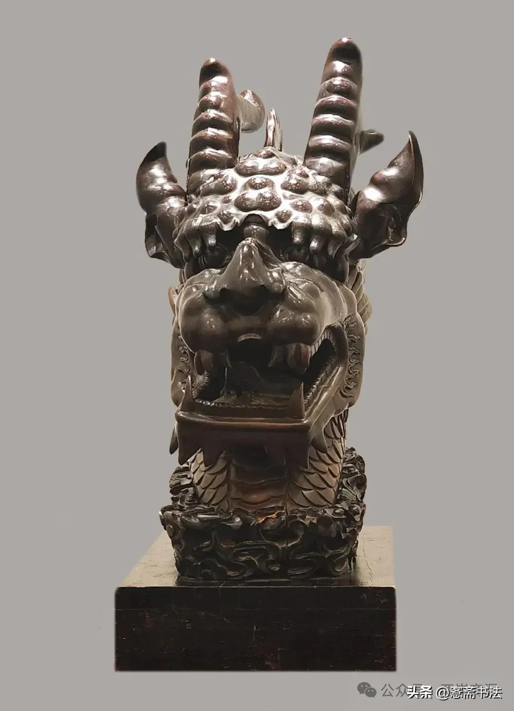 经过仔细检视与考据,认定其製作年代为19世纪,材质则是铜与木质结合,龙首的高度50釐米,而底座则有20釐米高。