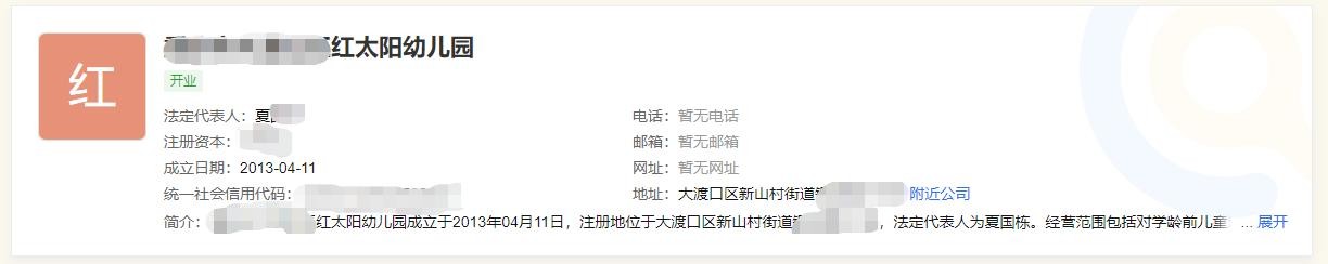然后笔者百度了一下这个号码,赫然出现了这个电话对应的人的姓名并得知了这名院长的姓名。同时也知晓了这名园长现在所开办的幼儿园名字依然叫红太阳,这是第一点。