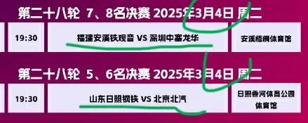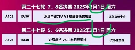 除了冠军亚军决赛比赛,第三第四名决赛,本周六下午同时还有5/6名决赛,7/8名决赛进行,都是主客场比赛,比赛时间同样是一周双赛本周六下午和下周二晚上。