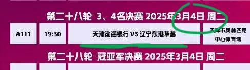 第二轮比赛 天津女排对阵辽宁女排。比赛时间是3月4号的晚上七点半开打。比赛场地是天津女排主场天津奥林匹克体育馆。排超联赛季军赛的第二轮比赛。