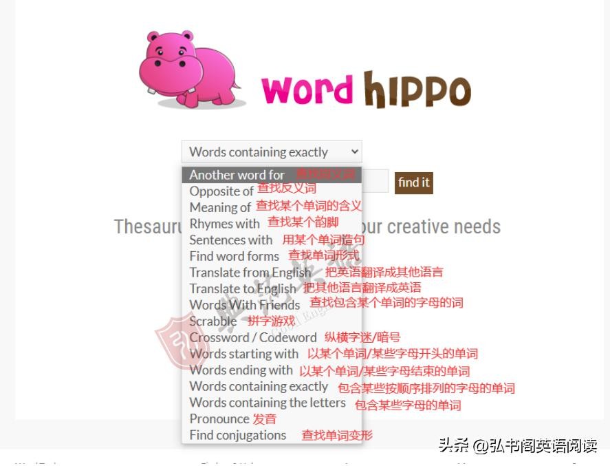 输入某个单词后,会呈现出很多同义词,有助于解决词汇量的问题。还有一些很有意思的功能:反义词、押韵词、英文例句、英文翻译、查找单词、英文姓名起源等。