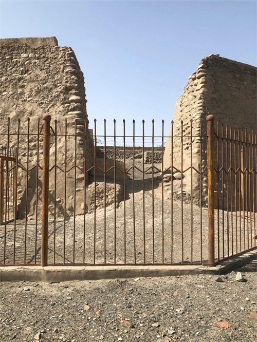 这是戍堡的进出囗,现留存的是这样,当时应该是有堡门的吧。通过这口子可见里边有残破的营房。该戍堡基本为正方形,边长31米左右,西北角的烽火台有10米高,占地面积约为1000平方米。1976年新疆考古队曾对戍堡内房址进行考古清理,出土了唐代文书,同时对墙壁内夹填的红柳做了碳十四年代测定,数据年代与唐代相当。
