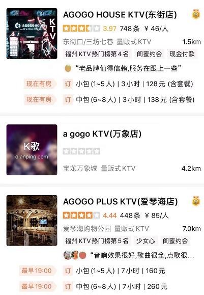 记者在大众点评上搜索AGOGO,发现“AGOGO量贩KTV”福州宝龙店、万象店,以及福清中环广场店均显示“歇业关闭”或是“尚未营业”状态。仍在营业状态的AGOGO house KTV(东街店)、AGOGO Plus KTV(爱琴海店)首页显示的是福建省娱汇企业管理有限公司,并非百利亨。