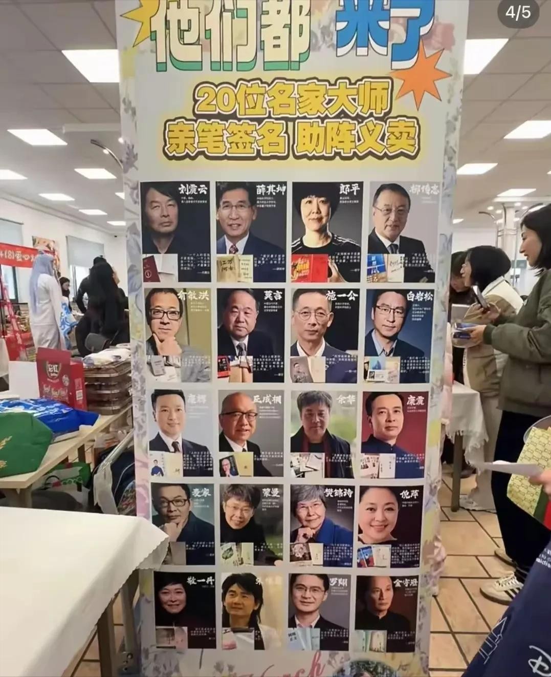 虽然是参加义卖会,董卿还是很认真的提前做了准备,她只做了一个很大的海报,上面印有俞敏洪、倪萍、莫言在内的20位名家大师,甚至连康辉的名字都有。