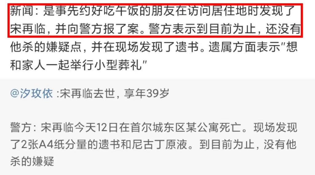 根据报道,宋再临是在自家公寓里被发现的,在现场,除了有尼古丁原液外,旁边还留着2张A4纸遗书,警方对现在调查后,得出了“否定他杀”的结论。