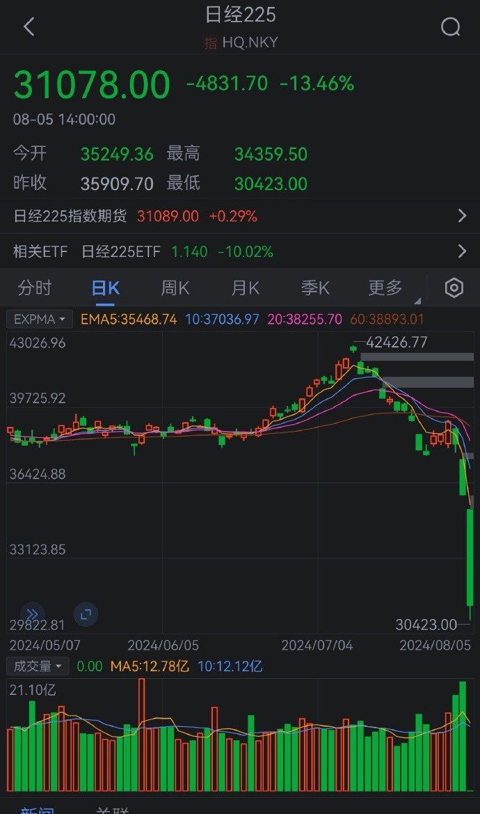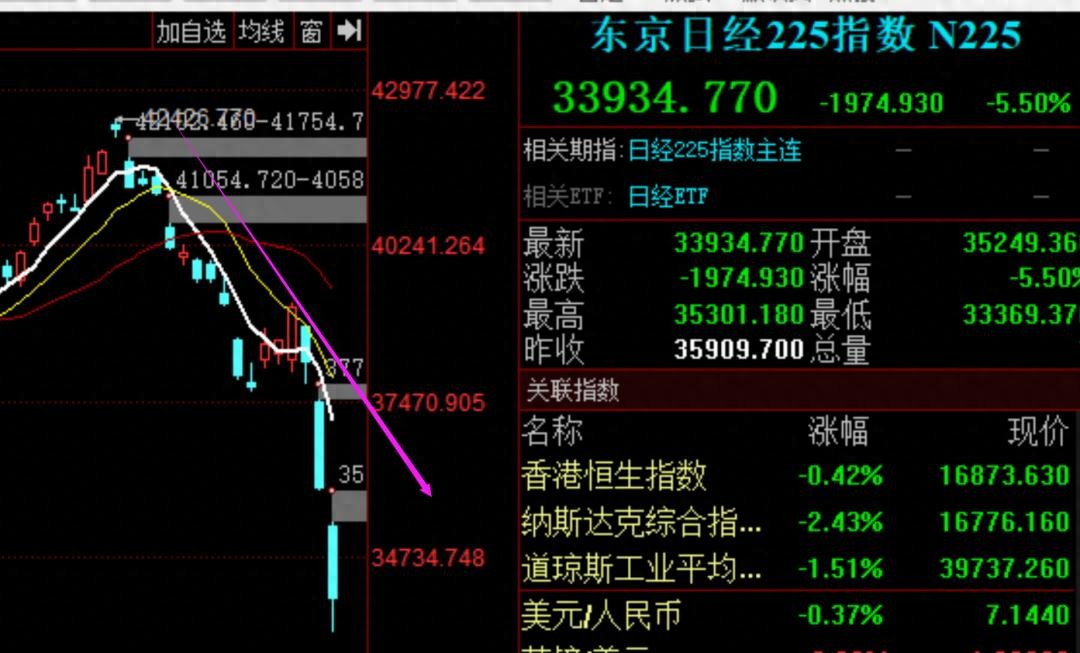 具体来讲日经 225 指数在周一的早盘时候,跌幅高于 6%,到了午盘阶段跌幅进一步扩大到 12%,一天之内差不多跌掉了 4500 点。