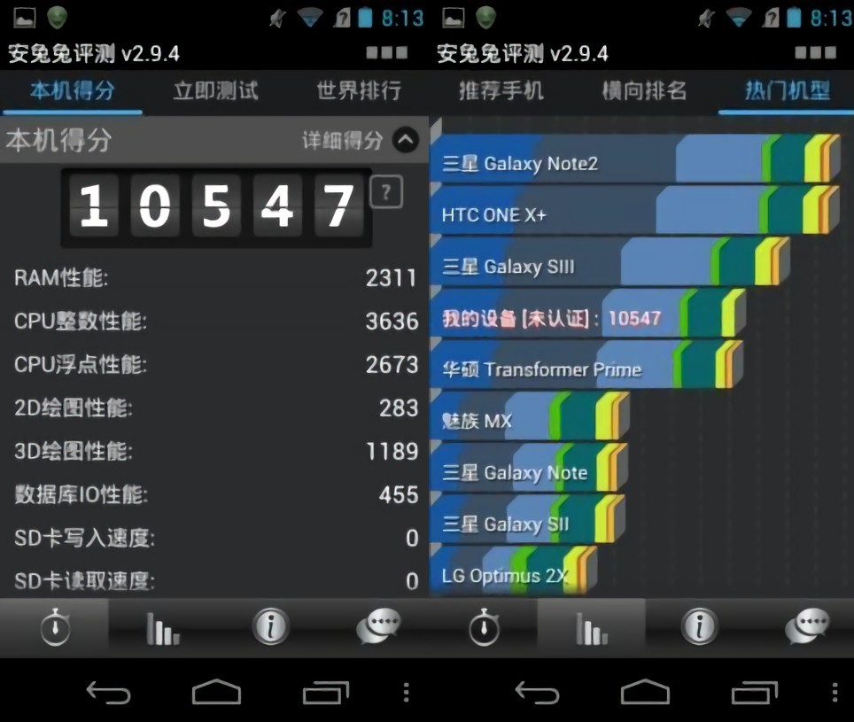 经过测试,在2012年版的安兔兔测试中,该机正常跑分为10547分,在使用外置散热器的情况下能达到13128分。因为中兴U950采用的是降频版处理器的缘故,跑分要比采用同款处理器的HTC One X略低一些,但是依然能有当年主流旗舰手机的性能水平。