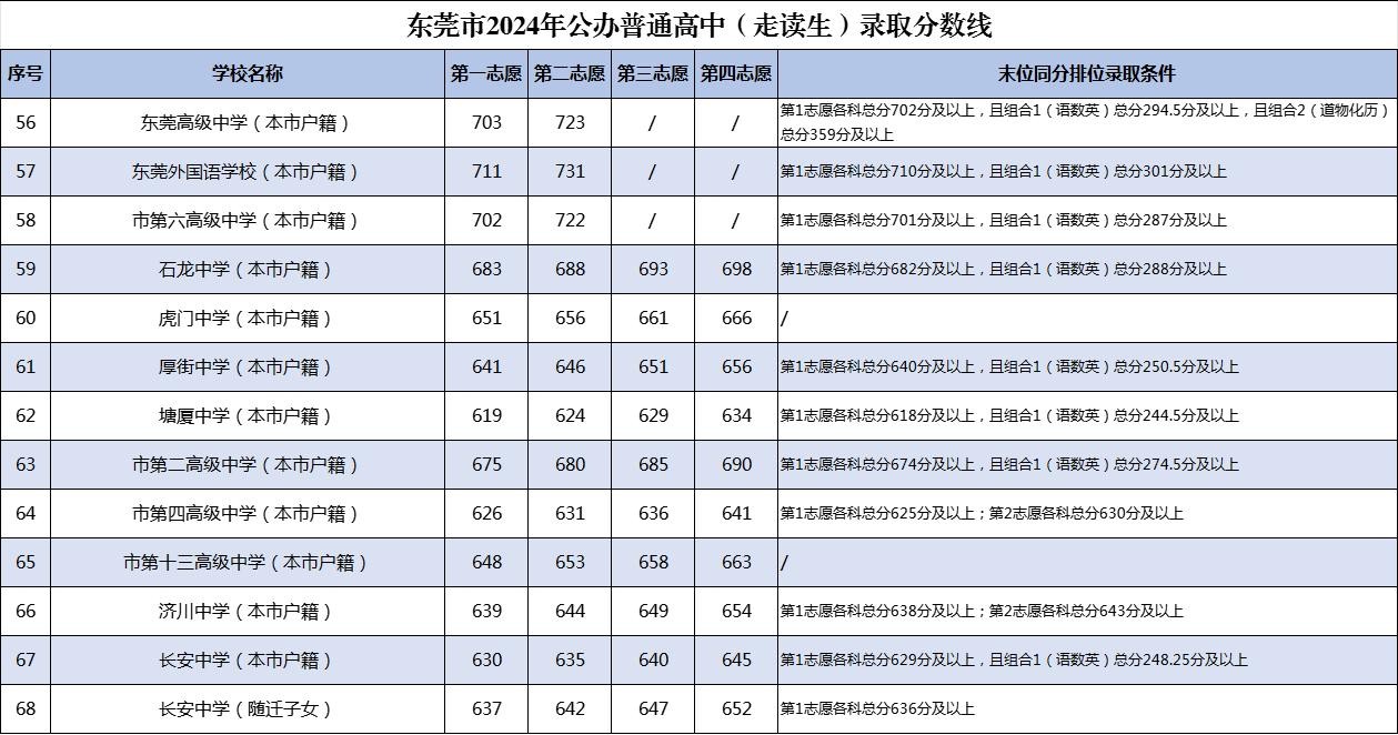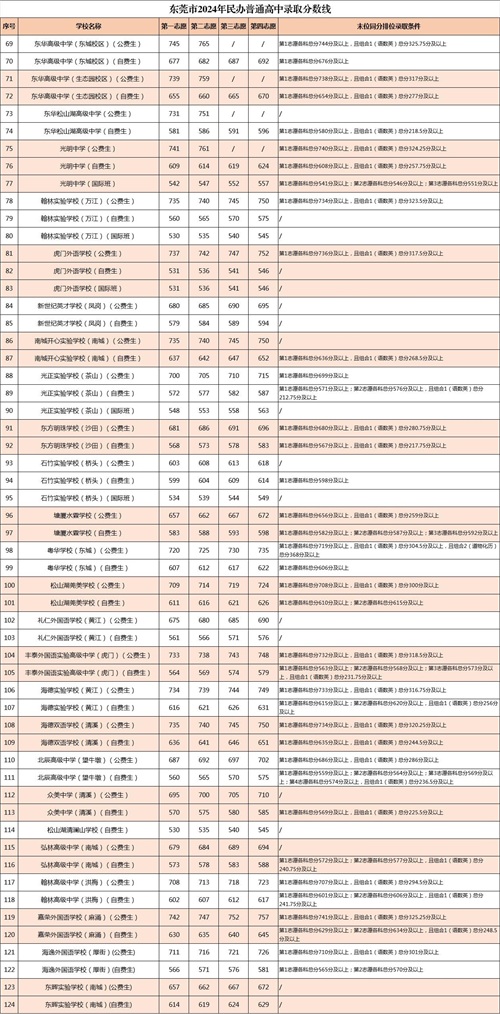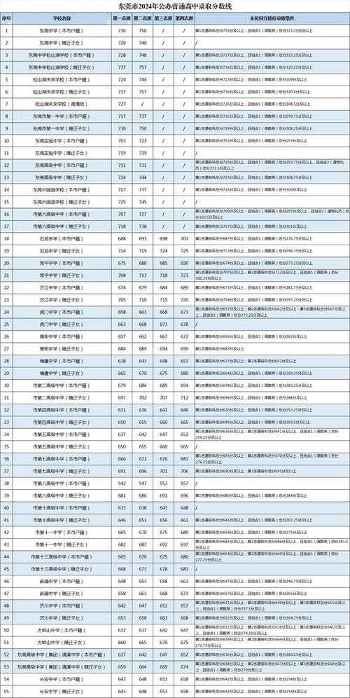 目前,东莞市2024年普通高中学校录取分数线和排位录取条件已划定。今年全市中考考生总平均分为605分(2023年为623分),普通高中录取控制线为530分(2023年为550分),预计普通高中录取率与去年持平。各校录取分数线见下表。