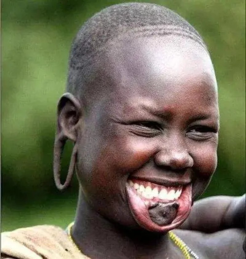 部落女孩在年轻的时候就会在下唇切开一个口子,在切口上装上盘子,等口子大一些的时候再换一个更大的盘子,久而久之 ,嘴唇上到洞会越来越大,耳垂上也是一样。