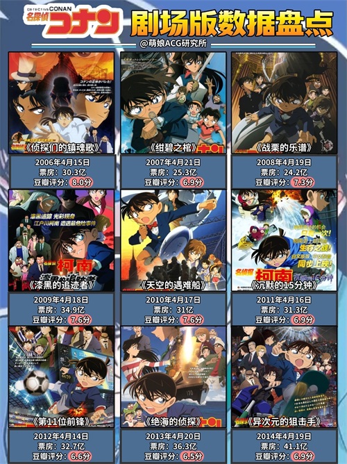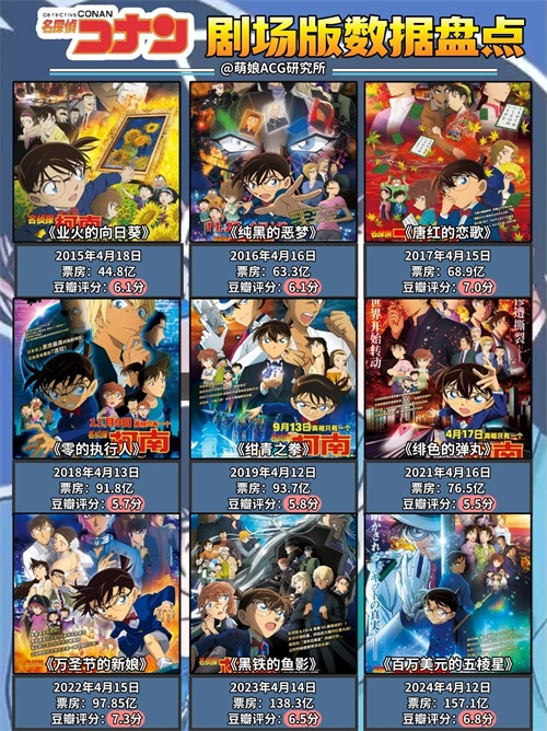 157.1 《百万美金的五菱星》(2024年)138.3 《黑铁的鱼影》(2023年)97.85 《万圣节的新娘》(2022年)93.7 《绀青之拳》(2019年)91.8 《零的执行人》(2018年)76.5 《绯色的弹丸》(2020年)68.9 《唐红的恋歌》(2017年)63.3 《纯黑的恶梦》(2016年)44.8 《业火的向日葵》(2015年)41.1 《异次元的狙击手》(2014年)