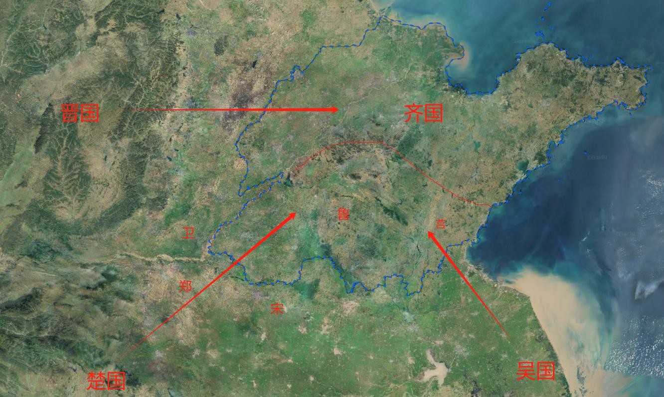 ▲春秋时期齐国的地缘困境示意图,富饶但四面通透的山东地缘板块