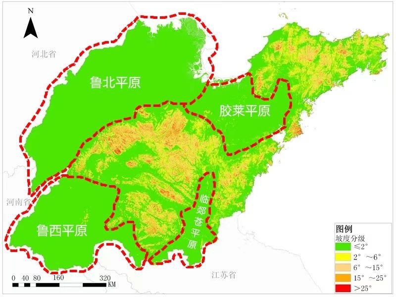 从上面的地形,显而易见,山东有山,但平原很多。别被地理上“山东丘陵”这个名称骗了,实际上仅限于鲁中南和胶东半岛部分。山东省的地形整体非常平,坡度图显示,全省坡度大于25度的区域,就泰山一隅和胶东零星,都是旅游胜地,大部分都是平地。山东的山,还远远没有大家印象中大平原的河南多。