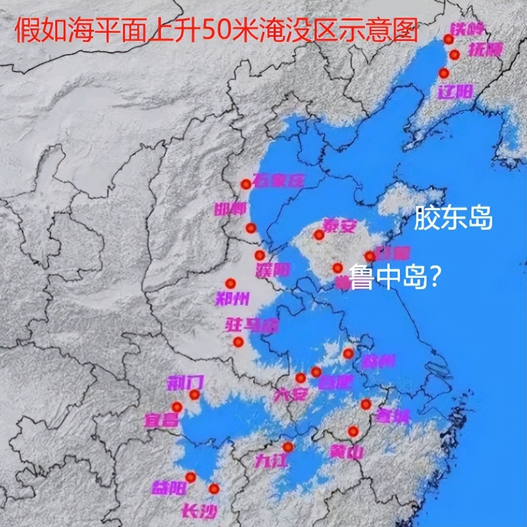 网上经常讨论,如果海平面上升会怎样?假如海平面上升50米,山东省会变成两个岛屿——胶东岛和鲁中岛,这种设想虽然不会发生,但能够更形象理解山东的地形特点。