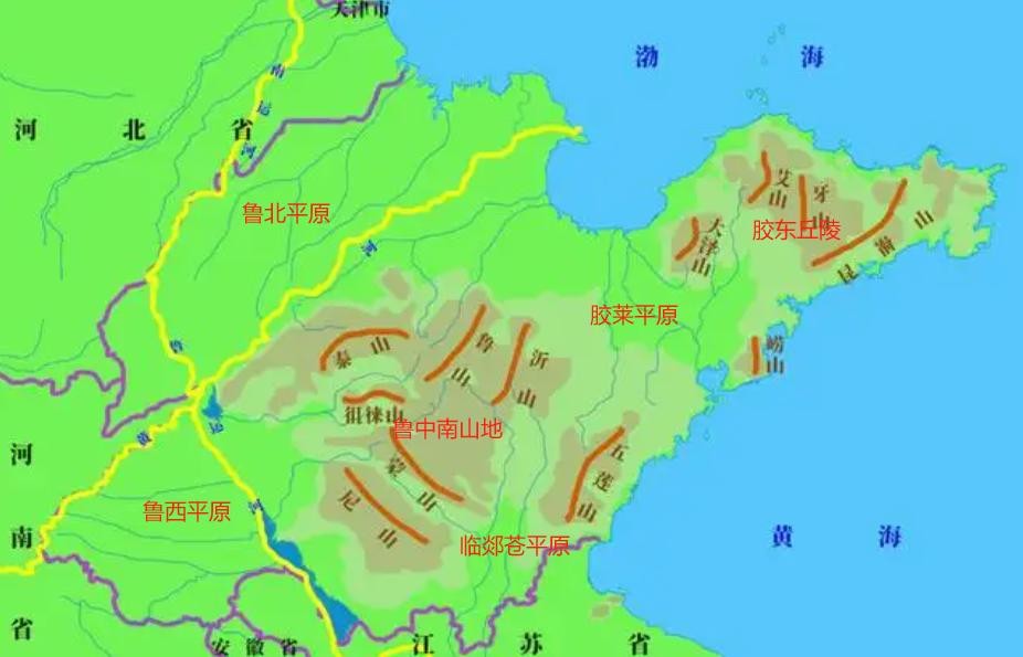 也就是说,如果细分,山东省是4片平原:鲁西平原、鲁北平原、胶莱平原、临郯苍平原;1片山地:鲁中南山地;1片丘陵:胶东丘陵。