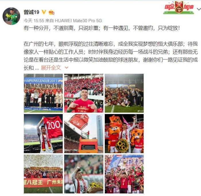 曾诚写道:“有一种分开,不道别离,只说珍重;有一种遇见,不曾邀约,只为绽放!在广州的七年,眼前浮现的过往清晰难忘,成全我实现梦想的恒大俱乐部;待我像家人一样贴心的工作人员;时时伴我身边经历每一场战斗的兄弟;还有那些无论是在看台还是生活中报以微笑加油鼓励的球迷朋友,谢谢你们一路见证我的成长和蜕变,也谢谢你们给了我继续挑战未来的决心与动力。”