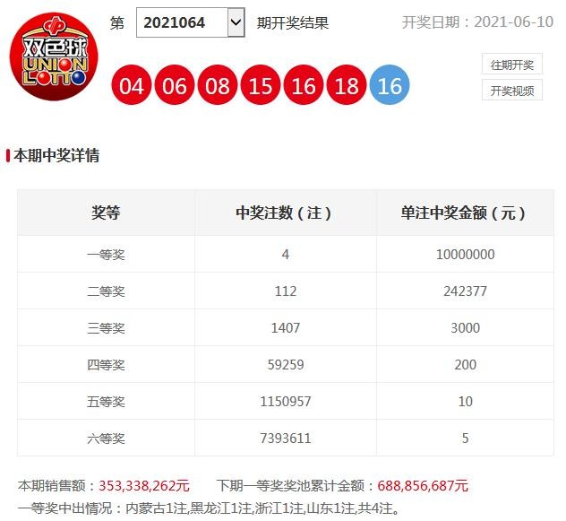 当期一等奖开出4注,单注奖金1000万元,被内蒙古、黑龙江、浙江和山东的彩民分享。当期二等奖开出112注,单注奖金24.23万元,本期销售额3.53亿元,下期一等奖奖池累计金额6.88亿元。